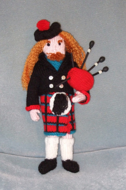 The assignment was this: "Nanny, can you knit me a little Scottish guy playing the bagpipes?" No, I couldn't. Nevertheless, I hated to say no. I only had about ten days to do it in, a fraction of the usual time. This wasn't for a birthday present or anything trivial like that, but a Grade 6 school project on Scotland, so I felt I had to do a decent job on it. And I had no pattern.